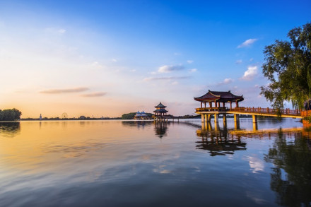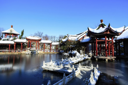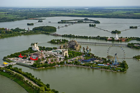 五冠橋位于旅游區(qū)主景觀帶的環(huán)湖路景觀帶上,它是根據(jù)揚(yáng)州瘦西湖五亭橋所建,因橋上建有五個亭子,便被稱為“五亭橋”。景區(qū)內(nèi)的五亭橋把五個亭子改成了形狀如冠的形狀,其余均同五亭橋,所以又名“五冠橋”。