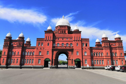 天下第一門是八里河旅游區(qū)的主園區(qū)大門。它綜合了俄、英、美三國的建筑特點(diǎn),造就了具有八里河藝術(shù)風(fēng)格的建筑,也是景區(qū)的標(biāo)志性建筑。這個樓堡式大門共有13個白色圓頂,中間一個較為突出,外墻飾有猩紅色的噴砂。