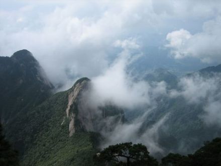 牯牛降峰峰有青松,無松不奇異,牯牛松漫山遍野,郁郁蔥蔥,樹冠如華蓋,干枝似虬龍,或怪獸張牙舞爪,或仙女廣袖輕舒,有的游龍走蛇,有的鳳凰展翅,千姿百態(tài),各顯神奇。雖沒有黃山上的松樹名氣大,卻比其更多一份天然情趣。那“連理松”本是兩株,日久天長長成一體,“在地愿為連理枝”,美好的愿望在這里得到印證;“探海松”長在危崖之上,主桿挺直,枝椏都曲曲折折探出崖外老遠;在一塊突出的巖石上,一松兀立如同雄鷹,那神情恰似一幅國畫鷹石圖;更令人嘆為觀止的是一株長在大石墩上的千年古松,高不到1米,卻有九枝十八丫,枝丫都長達數(shù)米,伸出老遠,枝干長滿著金黃色的蒼苔,遠遠望去,活象一條金甲巨龍盤于石上,有人名其為“蟠龍松”,甚至認為此為天下第一奇松。嘆曰:牯牛降的黃山松姿態(tài)奇特,單株絲毫不遜色于黃山上的名松,而浩瀚的牯牛松林海,卻是黃山所沒有的。