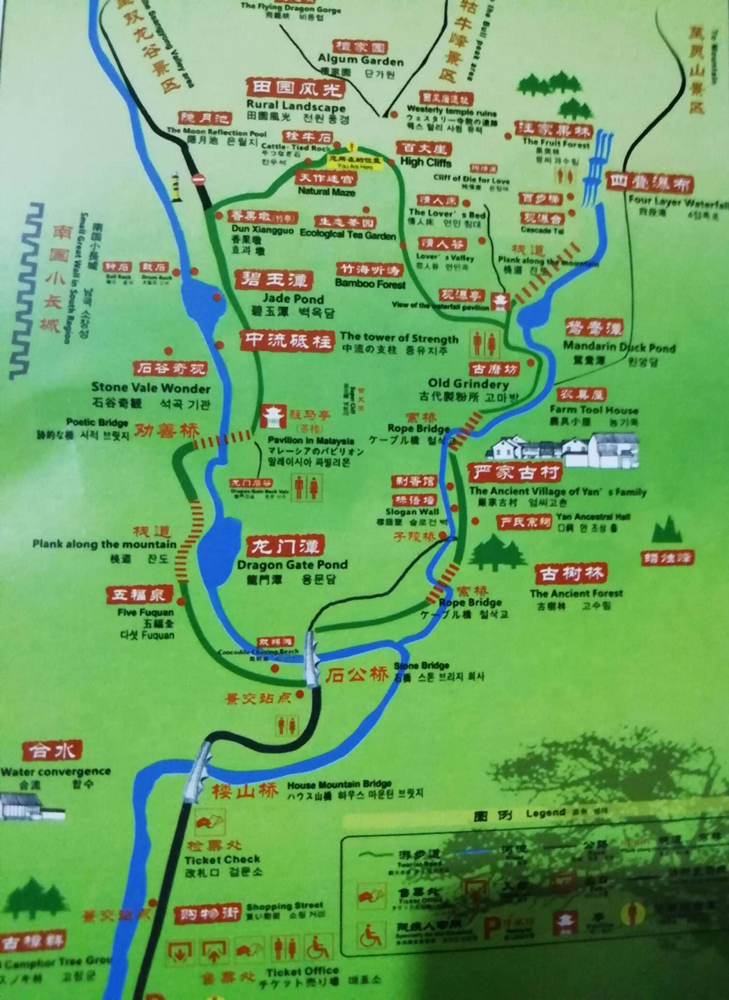 情人谷中有情人床、殉情崖,之所以叫情人谷,是因為此處曾演繹過一幕愛情悲劇。很久以前,嚴家村里住的大都是嚴、唐兩姓,嚴家事書香門第、官宦世家,而唐家一直以務農(nóng)為生,嚴家定出一條族規(guī),禁止和唐家通婚。偏有嚴家的姑娘和唐家的普通小伙因兩情相悅而私定終身,不顧嚴家人的多番阻攔,躲進了情人谷,想在深谷里長相廝守。嚴家派人追進了山谷,要捉他們到祠堂嚴懲。小伙子為心愛的人的幸福著想,從崖頂跳了下來。不料,姑娘也是一個重情之人,愛人已去,不愿獨留,也從小伙子跳崖之處縱身躍下,以身殉情。不過如今居住在這里的嚴、唐兩家早已結好。