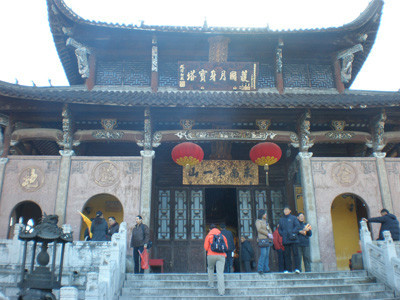 真身寶殿,俗稱“肉身殿”,又稱“肉身塔”,坐落在九華山神光嶺(老爺頂)上,為佛教徒朝謁九華圣地的主要場(chǎng)院所,這里因主供地藏菩薩,故與一般佛寺不同。九華山肉身殿是典型的宮殿建筑,殿高15米,門(mén)朝西南。入殿須登八十一級(jí)臺(tái)階,站在臺(tái)階之下,舉目仰望,可見(jiàn)南門(mén)廳上兩塊匾額:上額書(shū)“肉身寶殿”,下額書(shū)“東南第一山”。大殿四周回廊上方雕梁畫(huà)棟,仙鶴、麋鹿等珍禽異獸,牡丹、靈芝諸鮮花奇草。