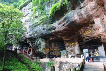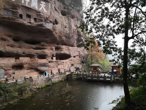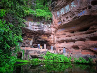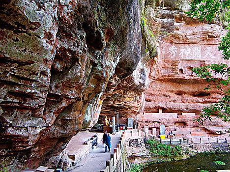 真仙洞府:過(guò)天門巖,下石階即達(dá)。這里危崖三彎折,相連如城垣。巖下通道沿砌石欄桿,欄外為碧蓮池,共構(gòu)一“叵”字形;崖間洞窟累累,依次有八仙洞、觀音洞、真仙洞(羅漢洞)、雨君洞、文昌洞、白馬洞、珠簾洞,就洞建宮宇,祀道教各路神仙,統(tǒng)稱真仙洞府。崖壁、摩崖題字石刻,如“天開(kāi)神秀”、“齊云勝景”等多達(dá)近百處。