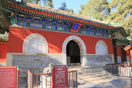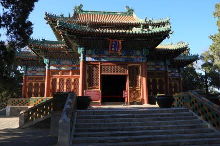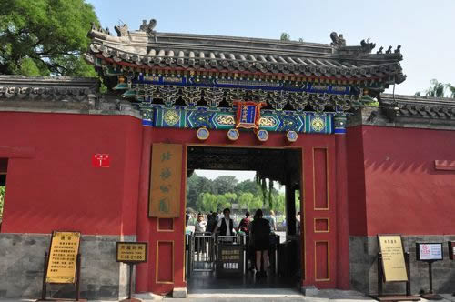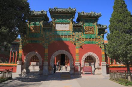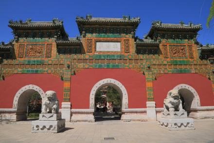 智珠殿,半月城位于瓊島東麓山腳下,座西面東與陟山橋相對(duì),建于乾隆十六年(1751年)。智珠殿建在半月城城臺(tái)上,紅墻綠瓦,四面有五個(gè)牌樓相對(duì),中軸對(duì)稱、布局別致是中國古建筑中比較少見的,殿內(nèi)原供奉文殊菩薩一尊。