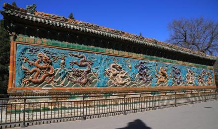 九龍壁是原大圓鏡智寶殿前的影壁,建于乾隆二十一年(1756年)。壁高5.96米,厚1.60米,長25.52米。壁的兩面用七色琉璃磚瓦鑲砌而成。兩面各有九條彩色大蟠龍,飛騰戲珠于波濤云際之中。壁上共有大小蟠龍635條。中國現(xiàn)存三座古代九龍壁,唯獨(dú)這座是雙面壁。