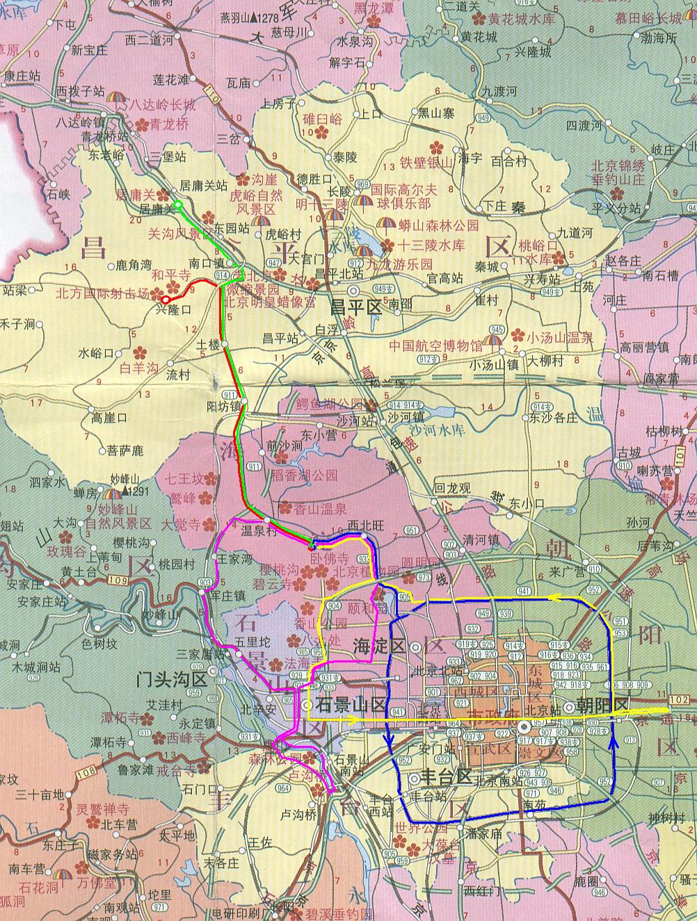 。。有著明顯四季更迭變化的北京,將時(shí)刻為您帶來美的感受。春的柔順與明麗,夏的嫵媚與多情,秋的成熟與風(fēng)韻,冬的純潔與晶瑩。她豐富的地貌特征,讓您穿林越谷,感受漂流與攀巖的刺激。在北京熙來攘往的城區(qū)之外,不出幾十公里,便是一派田園風(fēng)貌:數(shù)條河流縱情奔淌,千道峽谷雄奇幽深,崇山峻嶺云霧繚繞,密林草甸空氣清新,更有讓人魂?duì)繅衾@,永不厭倦的莽莽長城……娛樂項(xiàng)目更是花樣翻新:登山探險(xiǎn)、野炊宿營、驅(qū)車越野、徒步旅行、策馬揚(yáng)鞭、水中怡情等等,無論您是滑山(滑道)、滑水、滑冰、滑草亦或是滑雪,無論您想游水、游街、游空氣(滑翔傘、蹦極),總之,只要您是想不留下終身憾事,那就快來吧!北京的八個(gè)城區(qū)和十個(gè)遠(yuǎn)郊區(qū)縣,時(shí)刻等待您的光臨!