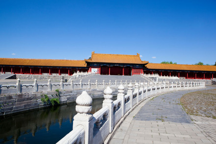 太和門(mén)前有面積約26000平方米的廣場(chǎng),內(nèi)金水河自西向東蜿蜒流過(guò)。河上橫架五座石橋,習(xí)稱內(nèi)金水橋。廣場(chǎng)兩側(cè)是排列整齊的廊廡,習(xí)稱東、西朝房,并有協(xié)和門(mén)(明代稱會(huì)極門(mén))和熙和門(mén)(明代稱歸極門(mén))東西對(duì)峙。東側(cè)廊廡在明代用作實(shí)錄館、玉牒館和起居注館,清代改作稽察欽奉上諭事件處和內(nèi)誥敕房。西側(cè)廊廡在明代為編修《大明會(huì)典》的會(huì)典館,清代改為繙書(shū)房和起居注館。