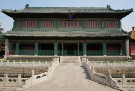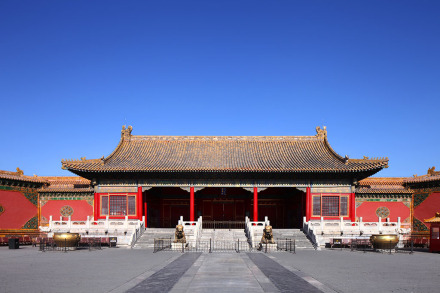 在故宮“內(nèi)庭”最后面。重檐廡殿頂。坤寧宮是明朝及清朝雍正帝之前的皇后寢宮,兩頭有暖閣。清代改為祭神場(chǎng)所。雍正后,西暖閣為薩滿的祭祀地。其中東暖閣為皇帝大婚的洞房,康熙、同治、光緒三帝,均在此舉行婚禮。