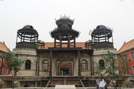延禧宮為內(nèi)廷東六宮之一,建于明永樂(lè)十八年(1420年),初名長(zhǎng)壽宮。殿前有東西配殿各3間。后院正殿5間,亦有東西配殿各3間,均為黃琉璃瓦硬山頂。宣統(tǒng)元年(1909年)在延禧宮原址興工修建一座3層西洋式建筑——水殿。水殿四周浚池,引玉泉山水環(huán)繞。主樓每層9間,底層四面當(dāng)中各開(kāi)一門(mén),四周環(huán)以圍廊。隆裕太后題匾額曰“靈沼軒”,俗稱“水晶宮”。1917年張勛復(fù)辟時(shí),延禧宮北部被直系部隊(duì)飛機(jī)投彈炸毀。