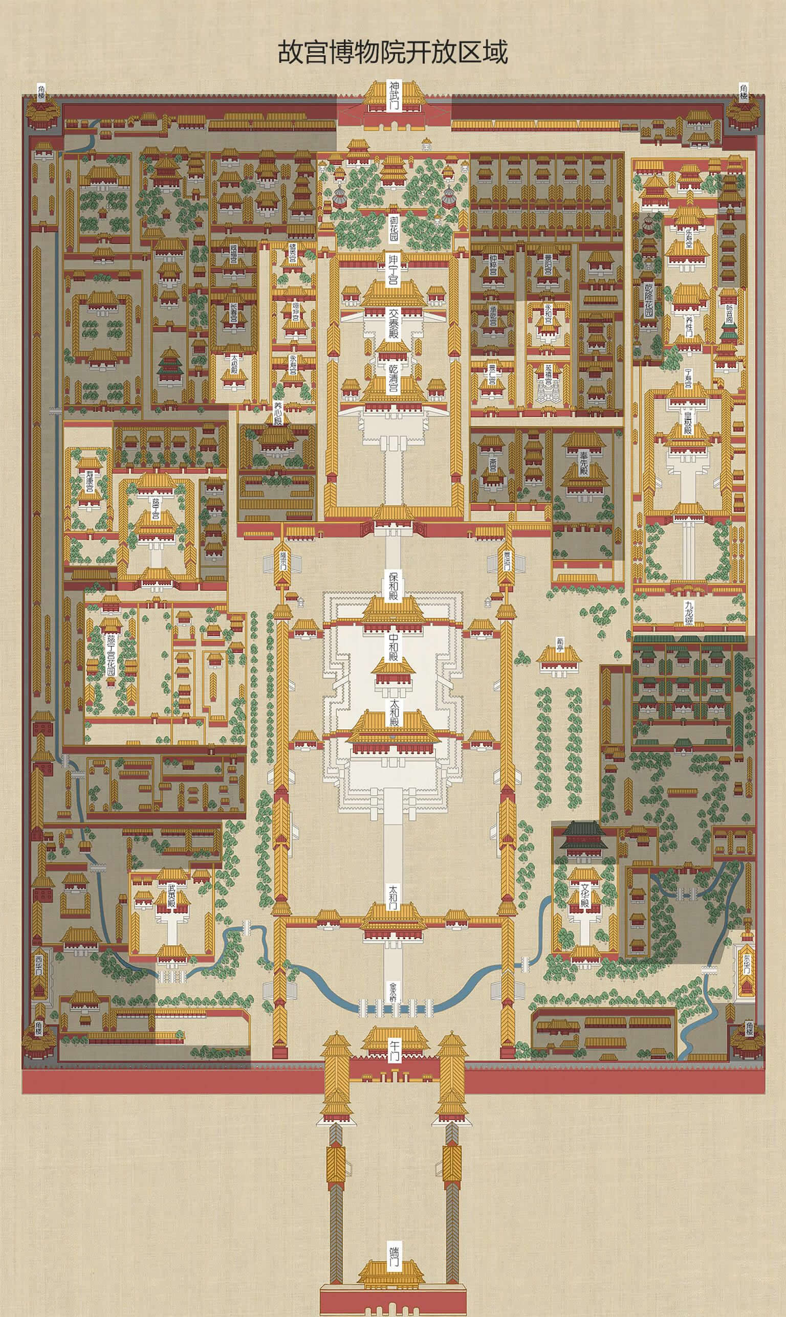 故宮南北長(zhǎng)約960米,東西寬約750米,面積72萬(wàn)多平方米,現(xiàn)存房屋8000多間。它周?chē)懈?0米的城墻,墻外有寬52米的護(hù)城河。四面各有一座門(mén),南為午門(mén)、北為神武門(mén)、東為東華門(mén)、西為西華門(mén)。紫禁城內(nèi)由外朝、內(nèi)廷兩大部分組成。外朝以太和殿、中和殿、保和殿為中心,東有文華殿,西有武英殿為兩翼,是朝廷舉行大典的地方。外朝的后面是內(nèi)廷,有乾清宮、交泰殿、坤寧宮、御花園以及東、西六宮等,是皇帝處理日常政務(wù)和皇帝、后妃們居住的地方。此外,東側(cè)還有寧壽宮區(qū)域,是清朝乾隆皇帝為做太上皇退位養(yǎng)老之所。