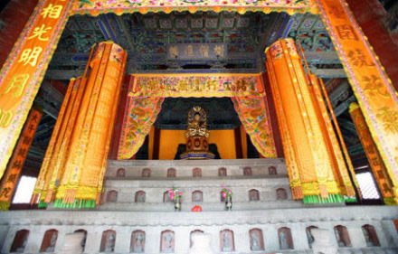 大雄寶殿:在天王殿后面,坐落在近兩米高的月臺(tái)上。門(mén)額上高懸清乾隆帝手書(shū)“蓮界香林”雕龍橫匾。原來(lái)還掛有清康熙帝所題“般若無(wú)照” 匾額和“禪心似鏡留明月,松韻如莫振舞風(fēng)”的楹聯(lián),今已不存。殿內(nèi)屋頂上有三個(gè)木雕藻井,上圓下方,井內(nèi)各雕有一條團(tuán)龍。下方漢白玉石雕的須彌座上供有明代鑄造的銅質(zhì)橫三世佛。正中為釋迦牟尼佛,南側(cè)為阿彌陀佛。北側(cè)為藥師佛。每尊佛像高3.2米,重5000公斤。大殿前左右兩側(cè)各有三間配殿,左側(cè)為伽藍(lán)殿,右側(cè)為祖師殿。