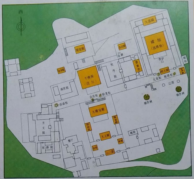 寺院坐西朝東,中軸線上依次排列山門(mén)殿、鐘鼓二樓、天王殿、大雄寶殿、千佛閣(遺址)、觀音殿和戒臺(tái)殿。其中戒臺(tái)是中心建筑。殿宇依山而筑。
