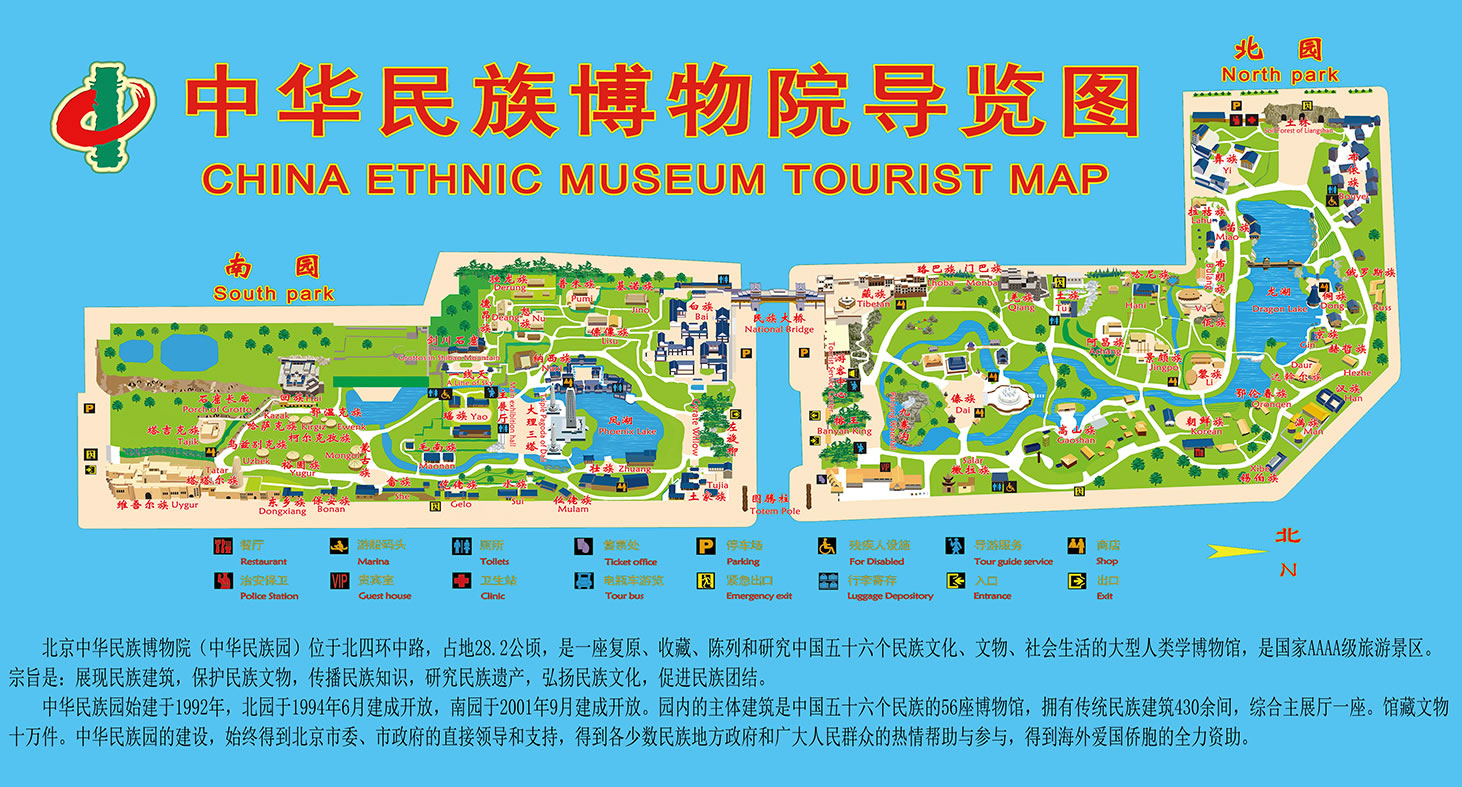 北京中華民族園,是集中國少數(shù)民族的傳統(tǒng)建筑、民族風(fēng)情,歌舞表演,工藝制作以及民族美食為一體的大型民族文化園地。園內(nèi)建有國內(nèi)最大伯鑄鐵雕塑以及仿真的熱帶榕樹林、水中溶洞,土林、盤龍瀑布,滄源巖畫、阿里山神木等。南園也已建成完畢,主要有民族博物館和雕塑廣場等大型設(shè)施,以及二十余個民族村寨。