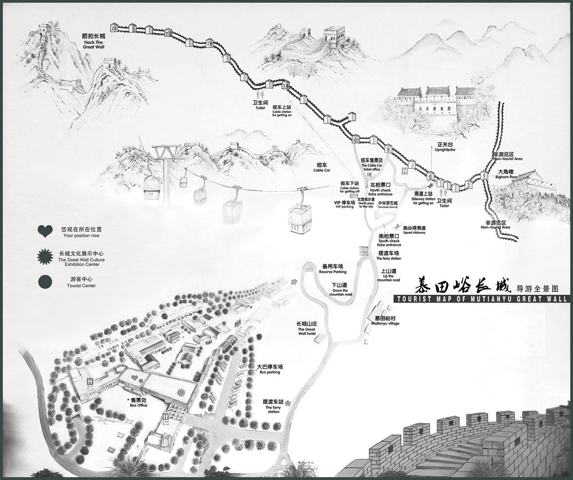 (六)富有立體感——慕田峪關(guān),地勢(shì)最低,海拔僅486米,往東,陡然上升,至大角樓(慕字一臺(tái))不到500 米,上升117米;往西,從慕字四臺(tái)(即正關(guān)臺(tái))至慕字十九臺(tái),起伏不大,較為平緩,從慕字二十臺(tái)至牛角邊最高處,只經(jīng)過(guò)近10座敵樓,就從慕田峪關(guān)的486米上升了533米,達(dá)到1039米,蔚為壯觀。
