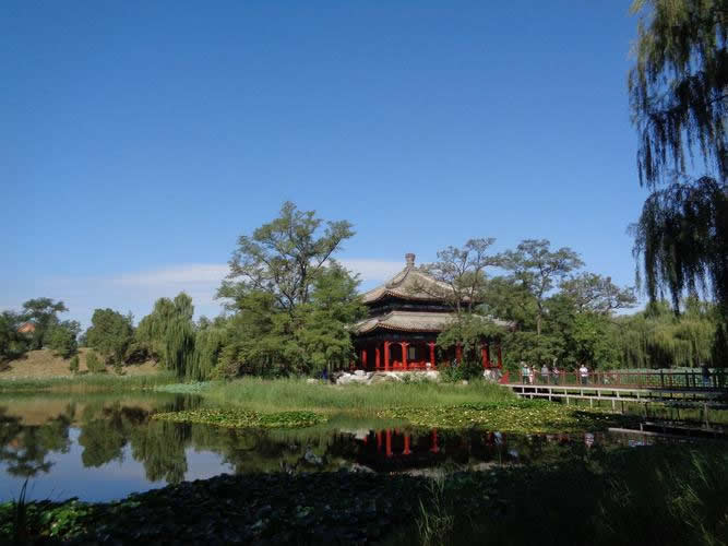 圓明三園的湖岸、池畔、溪濱,皆以垂柳為主。后湖四岸、福海周圍、南湖內(nèi)外,均遍植柳樹;北遠(yuǎn)山村至芰荷香,水溪曲折穿萬(wàn)柳;綰春軒,一樹楊柳滿院陰;雙鶴齋和深柳讀書堂,古柳籠堂合圍抱。