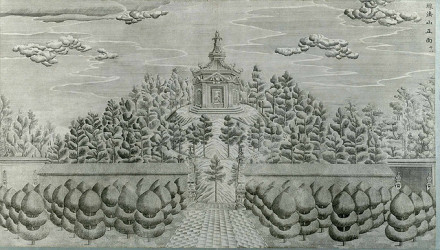 海岳開襟,是圓明園所有樓閣中最為豪華的一組建筑,海岳開襟建于圓明園中長(zhǎng)春園的西湖內(nèi),臺(tái)基為圓形,直徑近百米,上下兩層,漢白玉石憑欄圍繞。正樓為四出軒式的三層樓閣,下層為海岳開襟,南檐題“青瑤嶼”三字;中層為得金閣,題“天心水面”四字;最上層題“乘六龍”三字;臺(tái)的四面各設(shè)牌樓一座。外側(cè)對(duì)稱布置配殿、牌坊、方亭和圓廊,是一處輝煌端莊的建筑景觀。