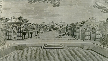 位于水木明瑟東面,是園中專門開辟的一座小城鎮(zhèn),仿照古印度橋薩羅國(guó)首都的城池布局而建,是供奉各種佛像和收藏佛經(jīng)的地方。城廓呈長(zhǎng)方形,南北長(zhǎng)、東西寬,四周筑有城墻,共辟4門。城內(nèi)街道呈十字形,內(nèi)建殿宇、房舍共326間,用游廊相連接;還建有數(shù)座金碧輝煌的牌樓。城前專門開設(shè)一條貫穿南北的買賣街,稱蘇州街,由宮中太監(jiān)扮作商人開市叫賣,法國(guó)教士王致誠(chéng)對(duì)買賣街有比較詳盡的記載。