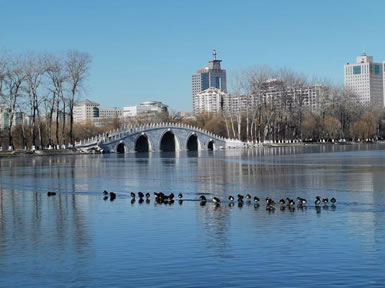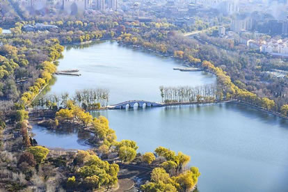 引水湖在公園東北部,有一幽靜湖區(qū),原來(lái)為林木囤養(yǎng)區(qū),植被繁茂。隨著公園環(huán)路的建設(shè),這個(gè)占地9.5公頃,地勢(shì)低洼的林區(qū),在1997、1998年被大規(guī)模回填改造。該景區(qū)的水系是自東湖而來(lái),至釣魚(yú)臺(tái)而去。北部地形舒緩開(kāi)闊,以雪松,銀杏和挺拔的白楊等喬木為主,散布于開(kāi)闊的草坪,沿公園環(huán)湖路北,配以海棠等春花灌木帶,極具90年代的疏林草地風(fēng)格。