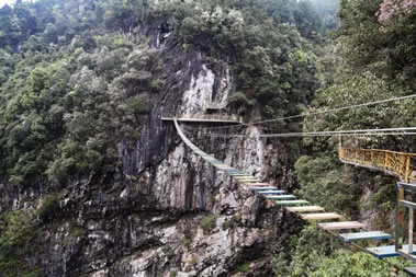 青龍橋位于景區(qū)接待中心服務(wù)區(qū)內(nèi),通過(guò)檢票口步行5分鐘可以到達(dá),是景區(qū)戶外項(xiàng)目,由長(zhǎng)80米、寬0.8米的鋼絲木板橋和長(zhǎng)30米、寬1.5米的玻璃棧道組成,高200米,站在青龍橋可俯視整個(gè)峽谷,可體驗(yàn)走鋼絲的感覺(jué),驚險(xiǎn)刺激。