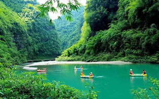 青龍谷位于彭水縣城西南18千米阿依河畔,峽谷高300米,長(zhǎng)1600米,蜿蜒幽曲如巨大的青龍。谷口塑有兩條青龍,叫作“雙龍迎客”,一是巖壁浮雕,龍身擺舞,龍爪張揚(yáng);一是盤(pán)龍騰空座雕。谷岸兩山逶迤交織,谷澗溪河蜿蜒穿洞,是典型的峽江峽谷風(fēng)光。谷內(nèi)兩岸翠竹連綿,綠樹(shù)成蔭。峽谷內(nèi)有一線天、黑洞等景觀。