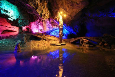 青龍洞位于牛角寨下行3.3千米處,溶洞環(huán)線總長(zhǎng)1590米,有上下兩個(gè)支洞,洞內(nèi)溫度宜人,常年恒溫16攝氏度。青龍洞是石灰?guī)r地區(qū)被地下水幾十萬(wàn)年長(zhǎng)期溶蝕而形成,洞內(nèi)沉積物極其豐富,鐘乳石、石花、石筍、石幔、石旗、邊石壩等分布密集。沿途有漢白玉觀音像、九子龍門(mén)、龍池、龍女彩帳、龍王戲水、擎天玉柱、步步生蓮等景點(diǎn)與玻璃棧道、激光燈光融合的特色夢(mèng)幻溶洞景觀。在溶洞盡頭有一幕兩百多米高的銀白瀑布,名洞天飛瀑,瀑布四壁呈圓錐形,指向高高的穹頂,聲如雷鳴,雄偉壯觀。