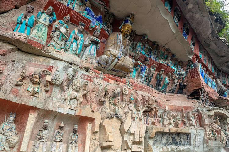 大足石刻開(kāi)鑿于唐永徽元年(公元650年),盛于宋代,F(xiàn)存摩崖石刻造像5萬(wàn)余尊,銘文10萬(wàn)余寧,遍布100多處。其中比較重要的有北山(包括北塔)、寶頂山、南山、石門(mén)、石篆山石刻,是大足石刻中規(guī)模最大藝術(shù)價(jià)值最高的石刻造像代表。