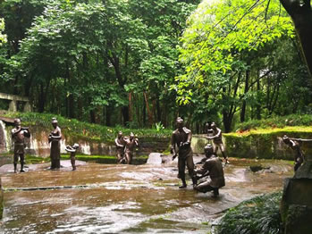 采石場(chǎng)遺址位于釣魚城基本陳列一展廳正對(duì)的游步道頂端。為讓游人了解釣魚城筑城之艱難與古代民眾付出之艱辛,遺址還原了700多年前釣魚城筑城采石的勞動(dòng)場(chǎng)景,其中的人物雕塑大小比例與真人一致。他們有的手握鋼釬在撬石頭,有的拿著手錘打鏨子,有光著胳膊抬石頭,同時(shí)還有前來送水的婦女與小孩,每個(gè)人物惟妙惟肖,充滿濃郁的生活味。