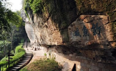 陳毅摩崖詩題刻位于城南始關(guān)門(清代修建)外右側(cè)近百米處的峭壁上。1927年2月,陳毅與3師政治部同事范英士登臨釣魚城觀看釣魚城歷代碑記,陳毅即興口占四句詩:“釣魚城何在,遙望一高原。壯烈英雄氣,千秋尚凜然。”
