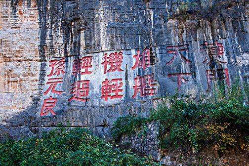 瞿塘峽摩崖石刻,位于重慶市奉節(jié)縣瞿塘峽口南岸白鹽山下的陡峭巖壁上,立面面積600平方米,共有自宋代以來的題刻十三幅,綿延180余米,鐫刻時間先后延續(xù)長達七百余年。所有題刻均為陰刻,篆、隸、行、楷皆備,內(nèi)容涉及頌德、詠史、觀景等。表現(xiàn)出了書法的原有韻味,具有極強的藝術(shù)感染力,又由于地處三峽要沖,給整個長江三峽增添了濃厚的文化色彩。