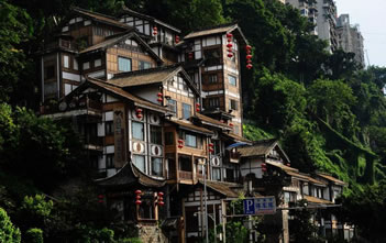 吊腳樓作為西南地區(qū)獨(dú)有的傳統(tǒng)民居建筑,最早可追溯到東漢以前。由于重慶山多,土地緊張,祖先依山就勢,因地制宜,利用木條、竹方,懸虛構(gòu)屋,陡壁懸挑,依山建造出一棟棟樓房。依山、靠崖、臨江是重慶吊腳樓的獨(dú)到之處,洪崖洞吊腳樓建筑群復(fù)原了巴渝古都風(fēng)貌,把古重慶最具特色的吊腳樓、古牌坊、木垂花、懸挑梁、雕刻樓廊、半山街市和青石板路等山地民居集中展現(xiàn)出來,在懸崖峭壁上建成高13層的吊腳樓群,因此被建筑業(yè)界稱為“中華懸崖城”,被中外媒體譽(yù)為“天空之城”。