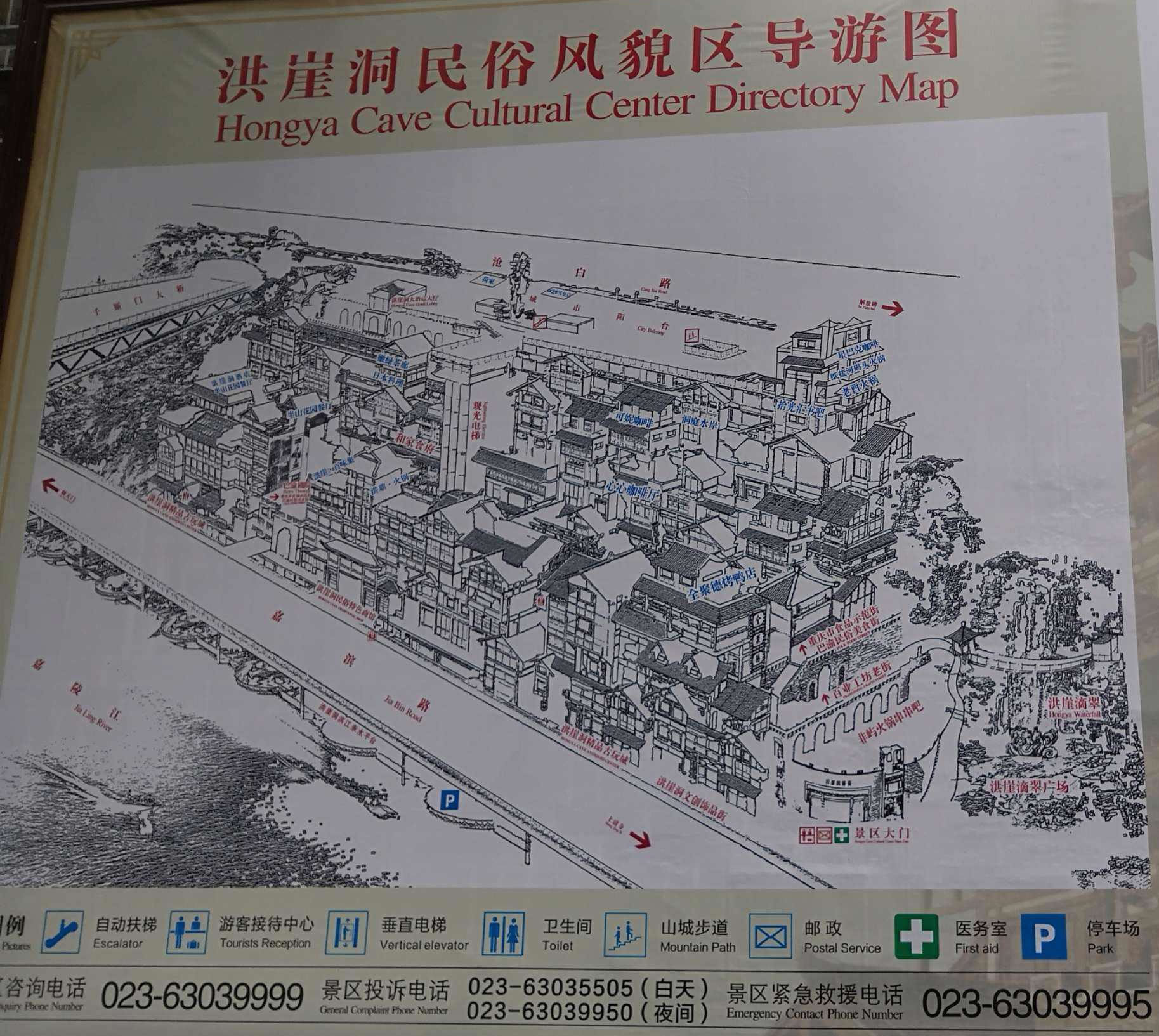 洪崖洞民俗風(fēng)貌區(qū)長約50米,總占地面積3.15萬平方米,分為紙鹽河精品古玩街、天成巷百業(yè)工坊老街、洪崖洞巴渝民俗美食街、洪崖洞異域美食街。有特色餐飲、休閑娛樂、巴渝民間工藝品、特色旅游商品及精品古玩等店鋪。洪崖洞一共有11層,夜晚燈光從晚上6點(diǎn)開燈,10點(diǎn)熄燈?赏跄_群樓觀洪崖滴翠,逛山城老街賞巴渝文化,燙山城火鍋看兩江匯流,品天下美食。形成了“一態(tài)、三絕、四街、八景”的經(jīng)營形態(tài),體現(xiàn)了巴渝文化休閑業(yè)態(tài)!耙粦B(tài)”指的是文化休閑業(yè)態(tài)!叭^”指的是吊腳樓、集鎮(zhèn)老街、巴文化;“四街”指洪崖洞的四條街:動(dòng)感酒吧街、巴渝風(fēng)情街、盛宴街美食街、城市陽臺(tái)異域風(fēng)情街。四條大街分別融匯了時(shí)尚元素,主題迥異特色鮮明。成為重慶娛樂生活、夜生活的標(biāo)向。“八景”指的是洪崖滴翠、兩江匯流、吊腳樓群、洪崖群雕、城市陽臺(tái)、巴文化柱、濱江好吃街、嘉陵夕照。