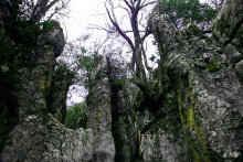 生態(tài)石林位于藥池壩南約1000米處,有一片郁郁蔥蔥森林掩蓋下的石林。巖石出露地表幾米或十幾米,石上苔蘚厚重,立石頂部、間隙雜樹叢生,黃楊、杜鵑、紅豆杉等繁茂生長,10公頃范圍內(nèi)若天然盆景園。
