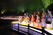 大寶洞位于三泉鎮(zhèn)大寶山上,海拔960米,洞口呈半月形,高2.5米,寬16米。洞分兩層,下層長500余米,有天然門道,分為前、中、后三部分,有石室精舍、頂天女媧、鎮(zhèn)寶靈象、海底世界、佛主講經(jīng)、天外來客、赧顏石猴等景點(diǎn)。