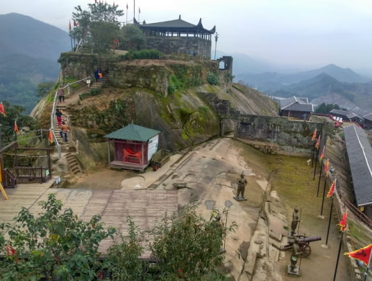 滑石寨位于金帶鎮(zhèn)滑石村3組,是平壩上突兀拔起的一座高260多米的孤峰。孤峰呈紡錘形,四周皆是懸崖峭壁,峰頂平地有6000平方米左右。峰西是一堵傾斜約75度、近10萬平方米的完整石壁,石壁上鑿有一條寬不盈尺的之字形石階,它是通達(dá)寨上的惟一路徑。從山下到寨上要走1個多小時路程,其中要經(jīng)過2000多級在石壁上開鑿的石階,山腰到山頂分別有兩道寨門把守。記者在現(xiàn)場看到,山腰一道寨門門楣上清晰刻寫著“未雨,嘉慶二年十月立”字樣。登上寨頂,數(shù)十間木質(zhì)結(jié)構(gòu)的房瓦痕跡依稀可見,青石砌的寨門和寨堡仍保存完好,四道墻體上都開有射擊孔。整個寨堡耗石約1萬多方,工程浩大,令人稱奇。