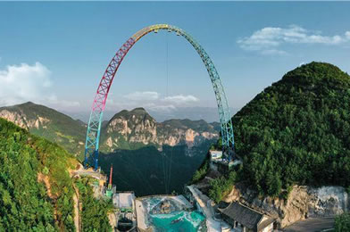 飛拉達(dá)是意大利文,是巖壁探險或鐵道式攀登的音譯,指在山體巖壁上建設(shè)由鋼扶手、腳踏、生命鋼纜等構(gòu)成的攀登徑道。龍缸景區(qū)飛拉達(dá)位于標(biāo)識性景點(diǎn)云端廊橋左側(cè),距石筍河垂直高度700余米,攀登徑道全長600余米,主要由彩虹橋、鋼索、長空棧道、十二生肖秋千橋、空中圖騰柱、攀爬梯道組成,其中彩虹橋全長62米,因橋面板上繪制有不同色彩和風(fēng)景而得名。鋼索橋長約41米,由一根走繩、兩根扶繩組成,走繩非常細(xì)小,刺激驚險。整個項目的錨固方式為采用化學(xué)錨栓錨固技術(shù)將鋼錨植入巖石1米多深,每一條鋼索的承重達(dá)到2噸左右。