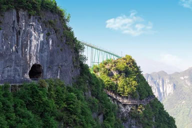 云端廊橋建在龍缸海拔1010米的絕壁之巔,懸挑長度26.68米,比美國科羅拉多大峽谷玻璃廊橋長5米多,位居世界第一。廊橋橋面、護(hù)欄采用全通透超白玻璃制作,可720度觀景。其造型設(shè)計、透視效果、驚險刺激程度全球領(lǐng)先。廊橋上每年要舉行世界低空跳傘大賽,人們可在驚險刺激的空中飄移中欣賞自然風(fēng)光。