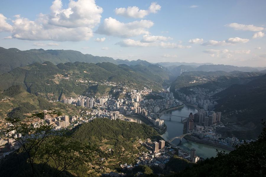彭水縣,位于鄂黔隆起帶,向四川中臺(tái)坳下滑的斜坡上,形成西北高東南低的地勢特征。海拔190~1860米,相對(duì)高差1670米。地處武陵山區(qū),地勢西北高而東南低。地形分為構(gòu)造剝蝕的中、低山地形。地貌類型復(fù)雜,自然環(huán)境各異,“兩山夾一槽”是彭水地貌的主要特征。各類地貌中丘陵河谷區(qū)占13.39%,低山區(qū)占52.83%,中山區(qū)占34.03%。