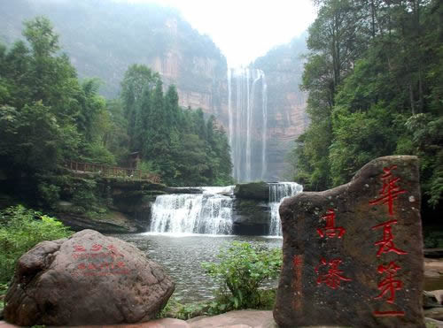 一雄一雌,一南一西,對(duì)巖相望,故名鴛鴦瀑布。南瀑高110.82米,為雄瀑,瀑水時(shí)而懸垂跌落,時(shí)而貼臂滑流;西瀑高90.25米,是雌瀑,瀑水絲絲縷縷,猶如戀人的情絲。雙瀑相望,一路飛珠涌向?qū)Ψ,最后在谷底融為一體,向北而去。