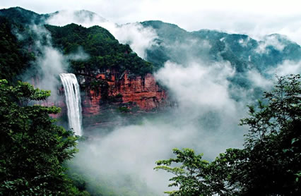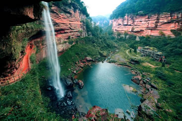 土地巖瀑布在土地巖壁畫對(duì)面,如一潔凈的白緞懸垂而下。瀑布高89米,寬25米,懸垂于綠樹(shù)紅巖之中,三面赤壁環(huán)繞,與巨幅丹霞赤壁兩相呼應(yīng),形成四山鎖絕谷、一水落幽林、綠樹(shù)映湖色、丹霞醉畫屏的絕景。