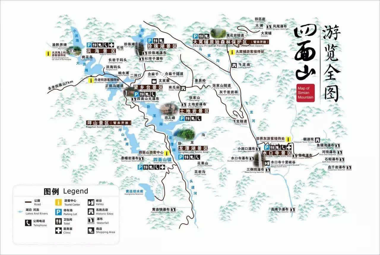 龍?zhí)逗䴙樽匀缓,左鄰四面山景區(qū)大門,右靠壁立陡峭的畫屏山。湖面海拔900米,長(zhǎng)近3000米,寬100米,最深處22米,湖水清澈晶瑩,湖岸樹(shù)木蔥郁。