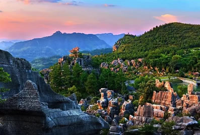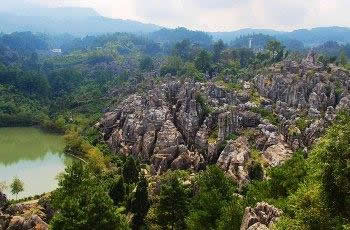 以地表石林為代表的典型的喀斯特地貌景觀十分吸引人。該類景觀表面呈虎皮狀,形成一系列各不相同的觀賞景點。在這里,群峰壁立,奇峰危石,可謂千姿百態(tài),石門、石寨、石柱等,酷似人工堆疊,卻無人工痕 跡;飛禽走獸的石頭,栩栩如生、惟妙惟肖;田園阡陌、炊煙裊裊,清泉碧池、懸崖雪瀑,白鶴青 、 碧空鳥語,清麗若未施粉黛的閨秀楚楚動人。其主要景觀有情朗峰、香爐山、巨扇、地縫一線天、化石 、石鼓、將軍石等數(shù)十處。顯示出萬盛石林景觀的美感與靈性。