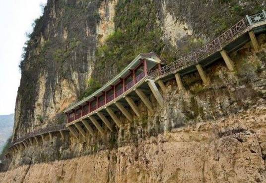大寧河古棧道遺跡,上下孔眼交錯(cuò)成倒“品”字,上排兩孔插木樁,鋪木板,下孔插木柱斜撐木板,構(gòu)成三角形支撐架,從而修筑成供人畜行走的“棧道”。 古棧道以寧河為主干,從龍門峽口,經(jīng)巫溪縣延伸到陜西的鎮(zhèn)平縣、湖北溪縣、重慶城口縣一帶。寧河棧道總長約400多千米,其長度超過著名的劍閣棧道,為我國古棧道遺跡中所少有。