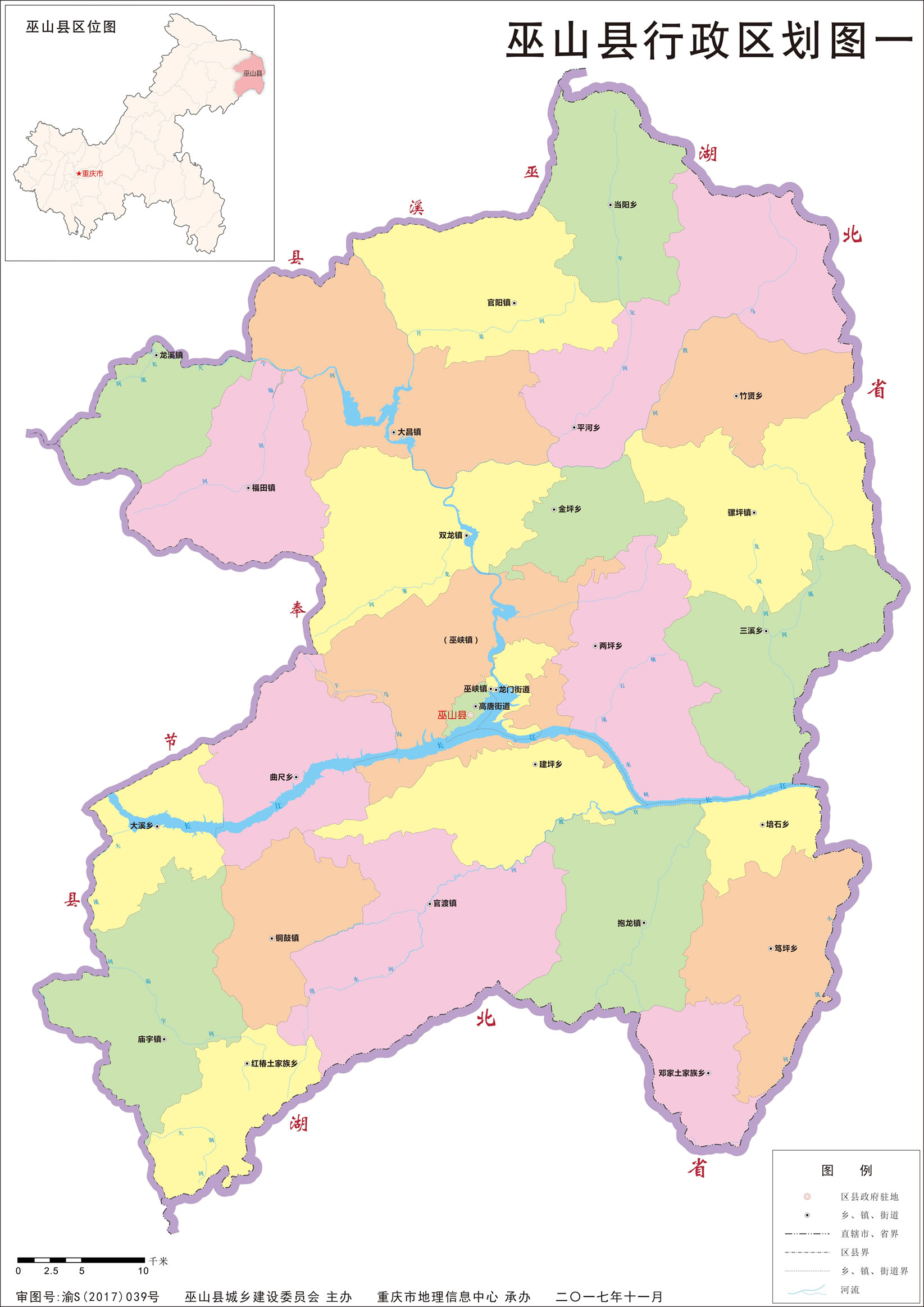 鎮(zhèn):巫峽鎮(zhèn)、雙龍鎮(zhèn)、大昌鎮(zhèn)、龍溪鎮(zhèn)、官陽鎮(zhèn)、騾坪鎮(zhèn)、抱龍鎮(zhèn)、官渡鎮(zhèn)、銅鼓鎮(zhèn)、廟宇鎮(zhèn)、福田鎮(zhèn)