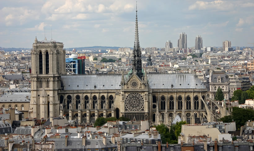 巴黎圣母院 巴黎圣母院(法語:Cathédrale Notre Dame de Paris),又名巴黎圣母主教座堂、巴黎圣母院大教堂,位于法蘭西共和國首都巴黎市中心城區(qū),地處塞納河中央西堤島上,與巴黎市政廳和盧浮宮隔河相望,為哥特式基督教教堂建筑;始建于1163年3月24日(羅馬教皇亞歷山大三世四年),是基督教支派天主教巴黎總教區(qū)主教座堂、法國首都最悠久和最具象征意義的紀(jì)念碑之一、歐洲最著名的哥特式大教堂之一、法國最具代表性的文物古跡和世界遺產(chǎn)之一,法國及歐洲文學(xué)文化地標(biāo)建筑。 巴黎圣母院平面為長形馬蹄哥特式拉丁十字形制,總長約127米,總寬約48米,總高達96米,總建筑面積達5500平方米,總占地面積達6000平方米;西立面置有兩座鐘塔,高約69米;內(nèi)部共有五個縱艙,包括一個中艙與兩側(cè)各兩個的翼艙,十字的頂部是祭壇,十字長翼是圣母院長方形主殿;東端是圣壇,后為半圓形的外墻,橫廳兩個盡段都有開門,旁置小塔;圣壇外有標(biāo)志性尖塔,高96米。巴黎圣母院是世界上第一座完全意義上的哥特式教堂,建筑本體的雕刻藝術(shù)和繪畫藝術(shù)及堂內(nèi)珍藏的大量藝術(shù)珍品具有極高的歷史文化價值和蜚聲中外的世界聲譽,是法國巴黎的象征,世界主流宗教基督教圣地。