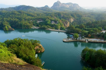 九龍湖景區(qū)左起云霄巖,右連竹安寨,面積10.84平方公里,湖水碧波蕩漾,幽深湛蘭,庫(kù)區(qū)水路迂回曲折,兩岸丹霞山巒陡峭,山奇水秀,遠(yuǎn)看湖上群山如游龍戲水,近觀壩下湖水如玉女散珠。