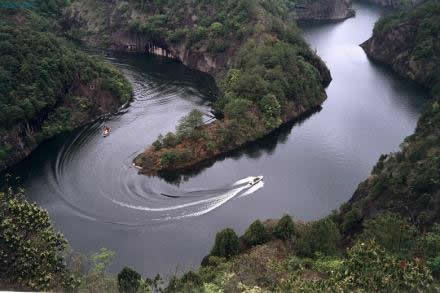 石門(mén)湖——坐落于冠豸山東南的石門(mén)湖,面積四百多畝,如一塊翡翠,鑲嵌在冠豸山的險(xiǎn)峰奇谷中,四周環(huán)山,“是連城昔日八景之一的"石門(mén)宿云"所在地。 要深度感受石門(mén)湖的清幽以及風(fēng)景如畫(huà),選擇蕩舟其間,無(wú)疑是最好的方式。登上游船,緩緩前行,船漿劃破波光瀲滟的湖面,推動(dòng)著小舟時(shí)而穿過(guò)狹窄的峽谷,時(shí)而閑庭信步開(kāi)闊的湖面,“水轉(zhuǎn)山間走,山回水中行”,山風(fēng)習(xí)習(xí),清涼舒坦。山在慢慢后退,水在慢慢后退,眼看就到湖的盡頭,“山窮水盡疑無(wú)路”,卻“柳暗花明又一村”,豁然開(kāi)朗處曲徑通幽,山環(huán)水繞,水傍山立。