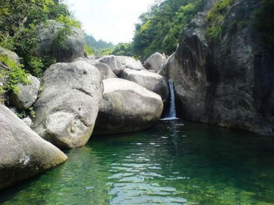 溪中大大小小巖石,被溪水沖刷得干干凈凈,不停的流水隨著不同落差,發(fā)出各種響聲,有琴聲、鑼聲、鼓聲等。尤其龍?zhí)渡铄,水色透明,泉水從高處落下,響聲更加清脆。順溪進(jìn)山,兩山對(duì)峙,東邊山上高山寨和茶園像是世外人家。對(duì)岸溪中一巖石宛如一頂紗帽,其上和著一株榕樹,枝葉茂盛,叫“紗帽潭”。