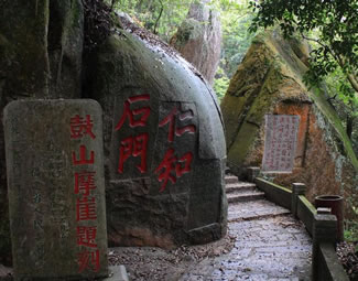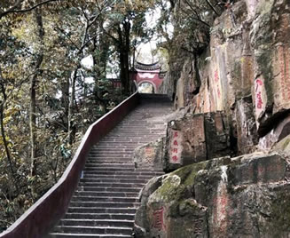 第四亭:“半山亭”。由第三亭至此,共有494級(jí)臺(tái)階。亭在半嶺,故名。過此亭百余階,有石刻“路通仙苑”,轉(zhuǎn)小徑可達(dá)“十八洞景”!鞍肷酵ぁ焙蠼300階有石刻“桃?guī)r洞口”,往東可到桃?guī)r洞,桃花精舍。