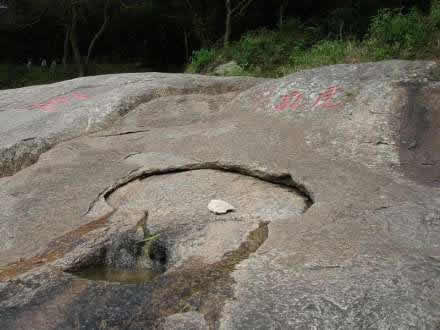 “虎乳泉”旁有“孔泉”石刻。泉眼上下皆石,上石如殼,下石如砥,中坼有孔竅,泉從隙縫里流出,注入一方形石孔中。上有呂道人題刻“虎乳”和宋朱熹撰寫的“源頭活水”石刻!盎⑷槿遍L(zhǎng)年不涸,游人耳貼巖石,可聞其巖下傳出“咕咚”的陣陣響聲。