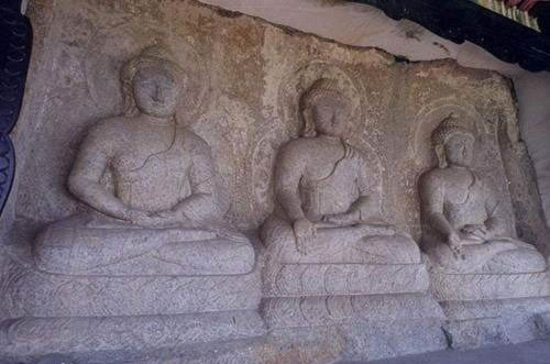 三世佛并排結(jié)咖跌坐于仰覆蓮花座上,主像通高約2.5米,左右二像稍低。佛像保存完好,皆為土蕃式樣:佛發(fā)螺鬢,上置寶嚴(yán)。面相上寬下窄,雙耳垂肩,肩寬腰細(xì),均著袒右肩袈,并以袈裟一角搭于左肩上。衣紋用凸雕線條表示,雖歷經(jīng)滄桑而線條依然明顯。石像均有圓形頭光及身光。中尊釋迦像,為現(xiàn)代佛,主管現(xiàn)代的世界,其造像作觸地印之魔相,一手向下?lián)岬,一手向上。左尊稱為藥師佛,即過去佛,主管過去的世界。他也是一手向下,一手向上,只是左掌托缽。右尊叫彌陀佛,是未來佛,作施定印之禪定相,即雙手交疊置于腹部。