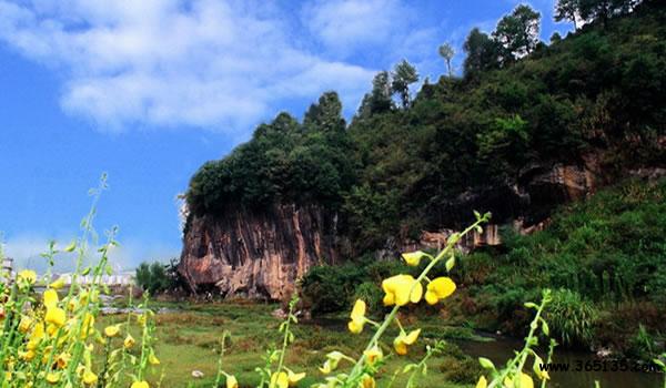 玉虛洞:在明溪縣北郊二公里黃坡山下。相傳古時這里龍蛇作祟被玉虛仙翁鎮(zhèn)服得名。玉虛洞分為明洞、暗洞、外景三個游覽點。明洞前有“觀音殿”,面積約150平方米,由三根天然石柱支撐。洞口有明代鐫刻“玉虛洞天”、“玉虛仙洞”、“玉宇天漿”等擘窠大字。洞口下方新建檐歇山式天柱閣。洞內(nèi)有天泉、斗獅、龜石、步丹臺等十幾景。后為“桃華洞”,廣容千人,巖石晶瑩、色彩斑斕,有佛頭巖、祥云巖、隱鵲巖、躍魚石等十幾景。其中虛鳴竅最妙,用蘆掃輕拍即發(fā)出巨響。